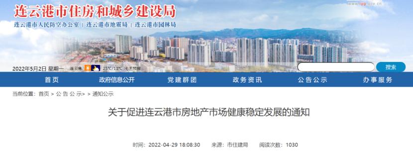 4月29日,连云港市房地产市场调控发展领导小组办公室发布《关于促进连云港市房地产市场健康稳定发展的通知》,自2022年5月1日起,从六方面调整房地产市场调控相关措施。