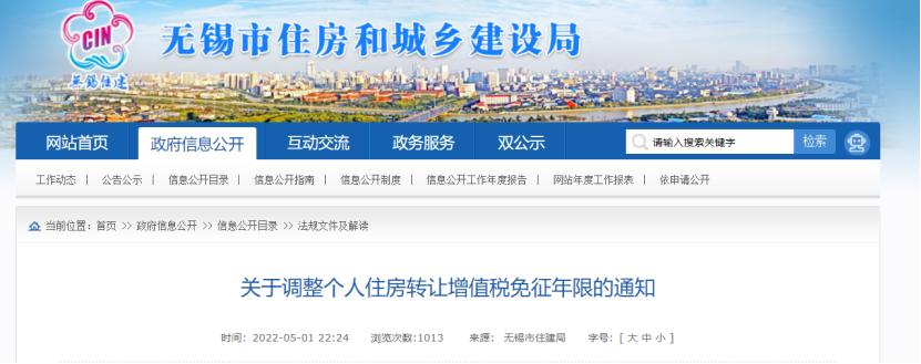 除了梅州和连云港出台降首付等稳地产政策,5月1日,无锡市住建局、国税总局无锡市税务局联合发布《关于调整个人住房转让增值税免征年限的通知》,明确将个人住房转让增值税免征年限由5年调整为2年。