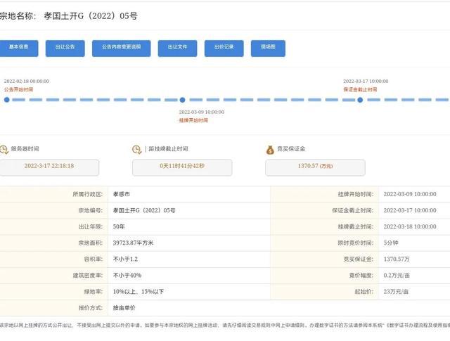 孝国土开G(2022)05号位于孝感市高新区复兴大道以南、崇德路以东,该地块于2022年3月9日挂牌,3月17日保证金截止,保证金1370.57万。地块宗地面积39723.87平方米,竞拍幅度0.2万/亩,绿地率10%以上,小于15%以下,出让年限50年,也就是工地用地,要建厂房了。